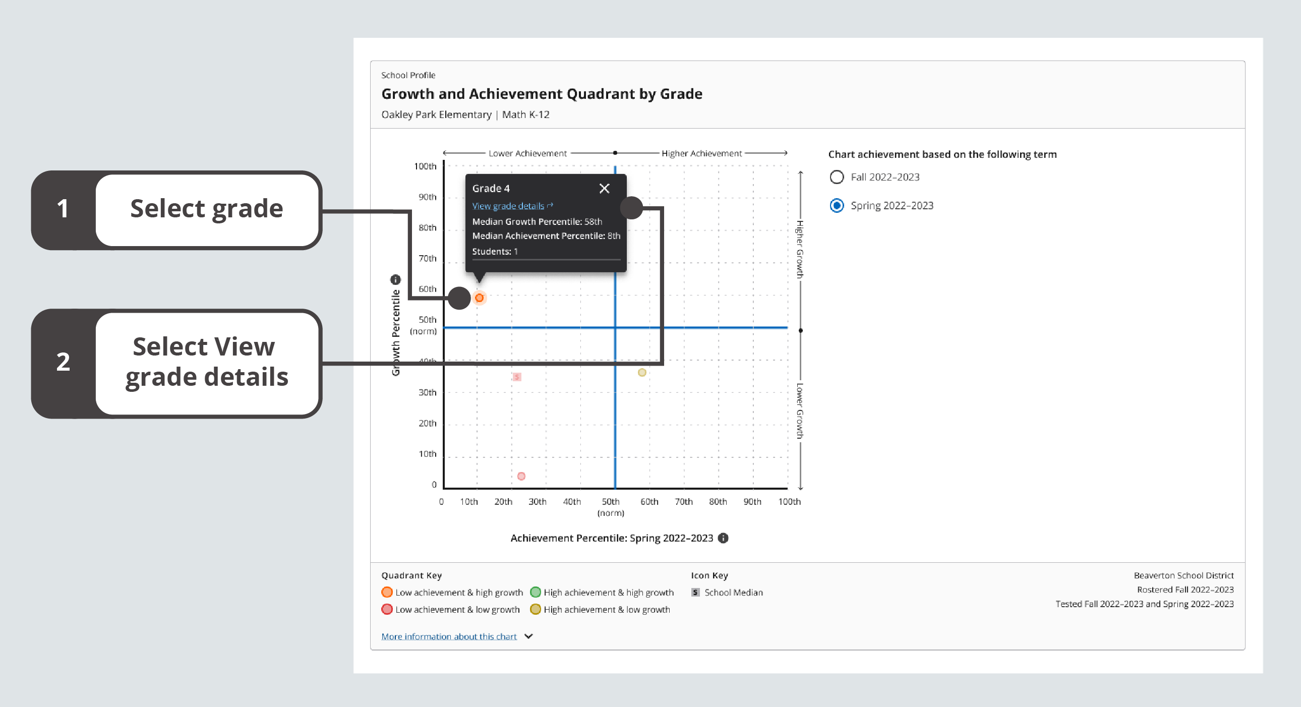 Growth and Achievement Quadrant with an expanded grade information popover
