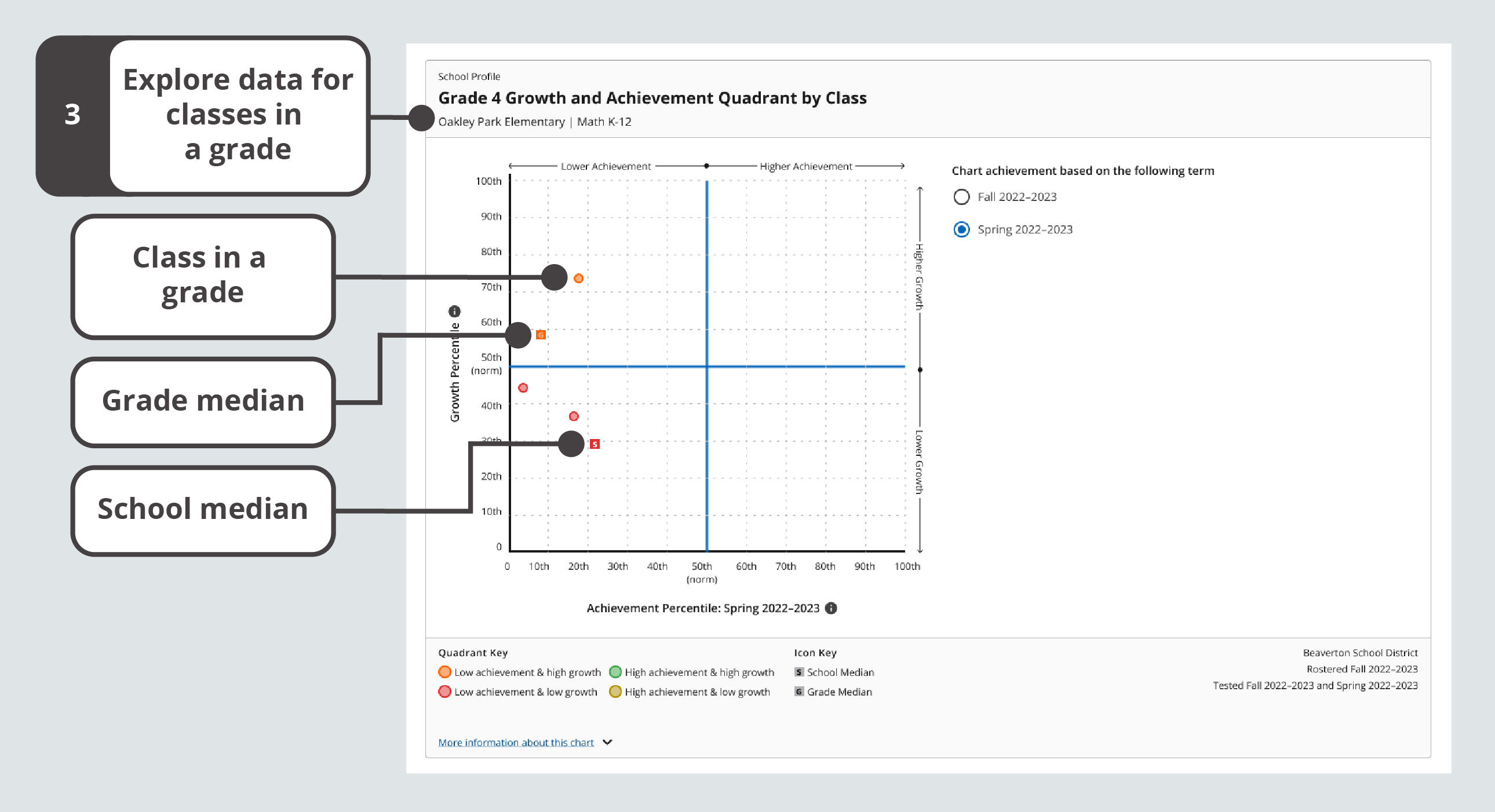 The Y-axis position shows the grade’s median growth percentile. This is a measure of the grade’s growth between the Start Term and End Term.