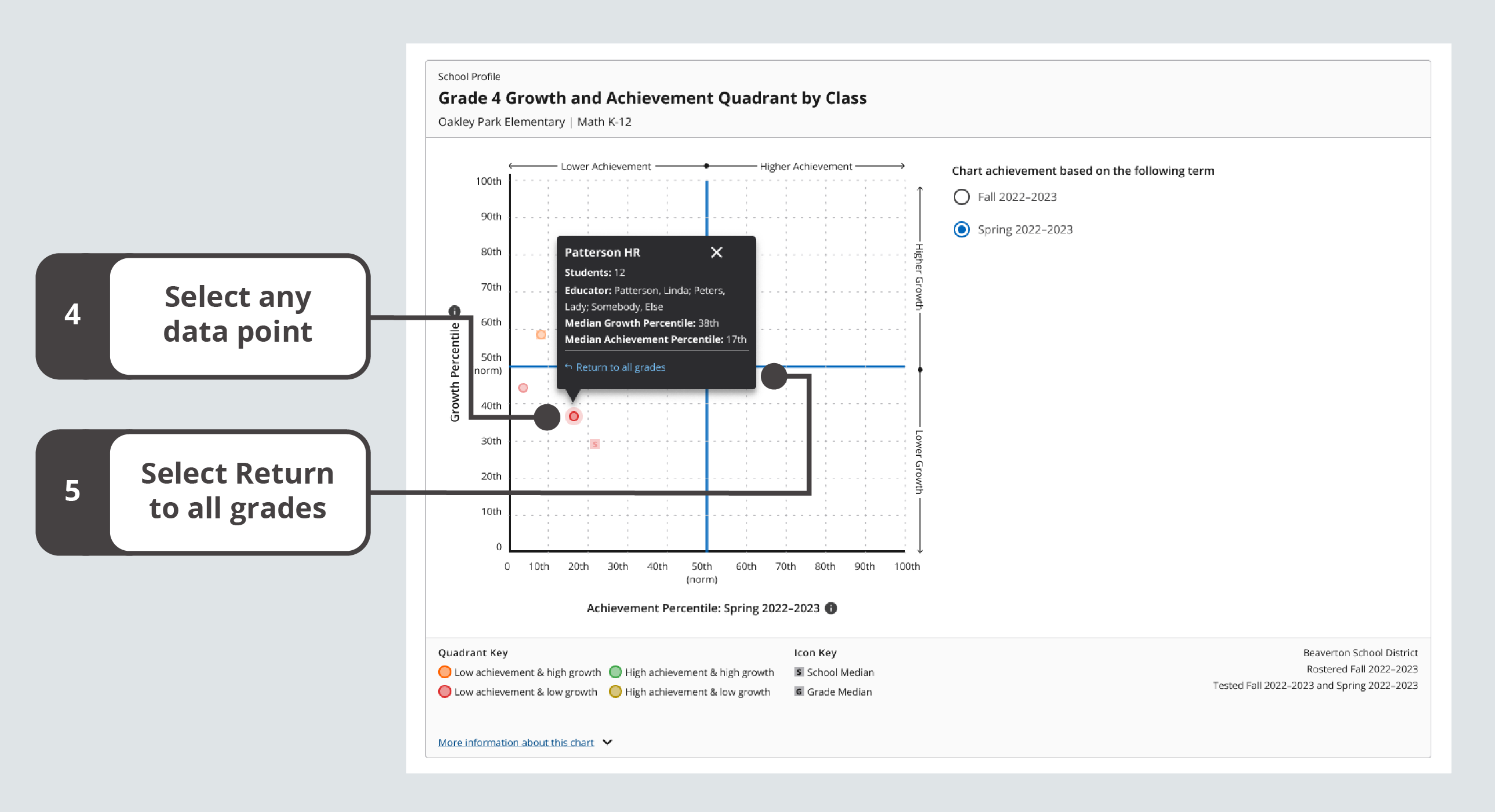 4. To return to all grades, select any of the data points or medians on the Growth and Achievement Quadrant.