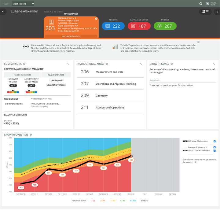 • By default, growth is set to the Projected Growth, if available. This growth projection is personalized to your student, because it is based on matching peers from NWEA norms (same prior RIT score, grade, and weeks of instruction between testing).