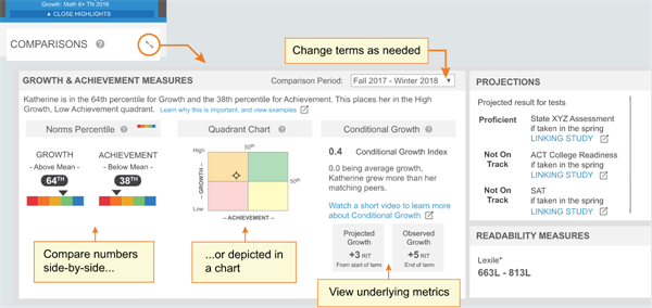 • Next, consider Growth Percentile, if available. It shows the level of growth your student would have to show in order to reach the Achievement Percentile. Higher growth numbers mean a greater challenge.