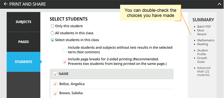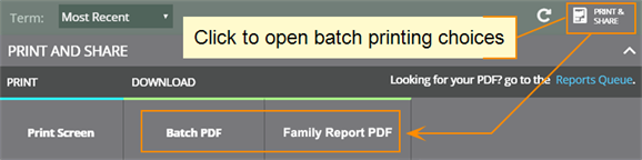 For family conferences and other meetings, you can quickly prepare printed reports for all students or a selection. While viewing any student in the Student Profile report, click Print and Share, and then Batch PDF: