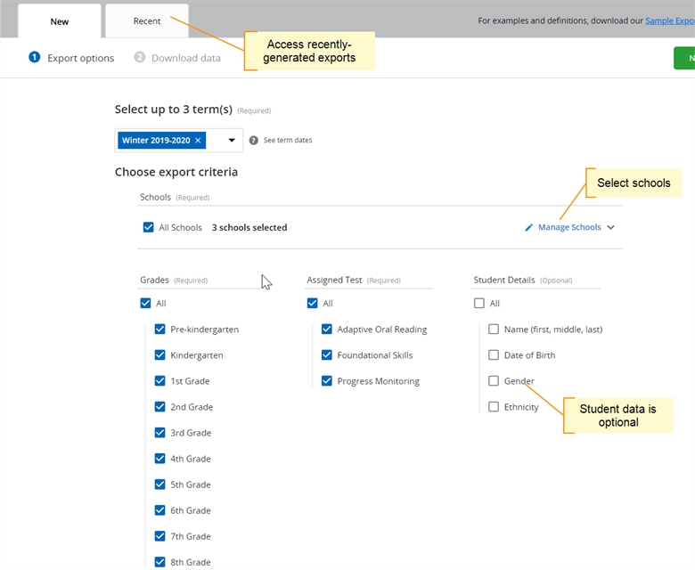 Choose your criteria and click Next. Student ID will always be included in the file; other student data is optional. You can then choose to save the spreadsheet as an Excel XLSX or CSV file. Once you've generated an export, it will be available for 14 days under the Recent tab.