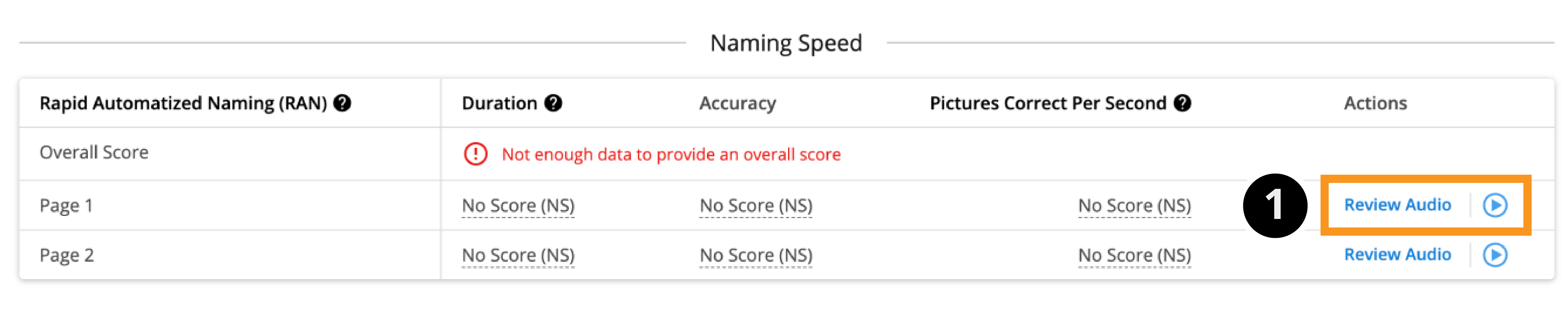 No Score (NS) appears when the recorded audio for a test cannot be scored by the speech-scoring engine.