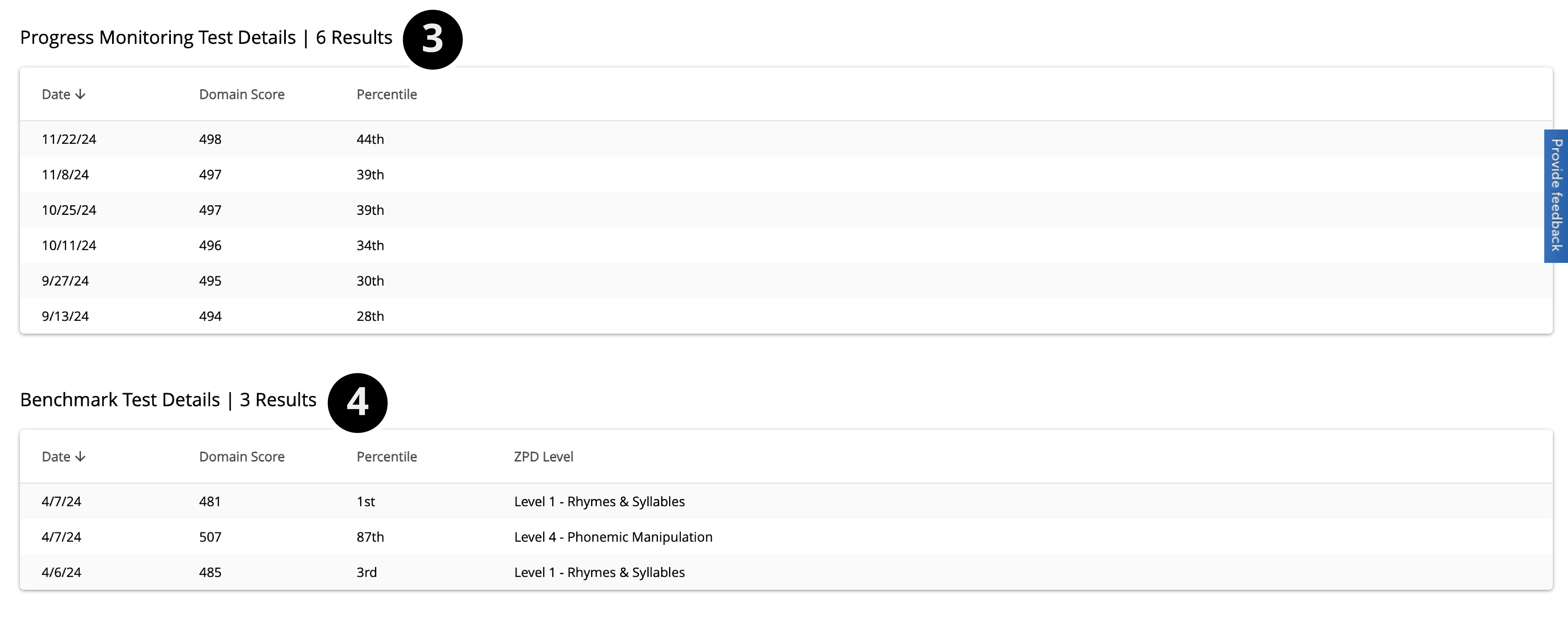 Students who completed one or more Progress Monitoring tests will have data in the Progress Monitoring tab of their Individual Student report. Learn more about how to access and interpret the Progress Monitoring data using these annotated graphics and corresponding numbered steps.