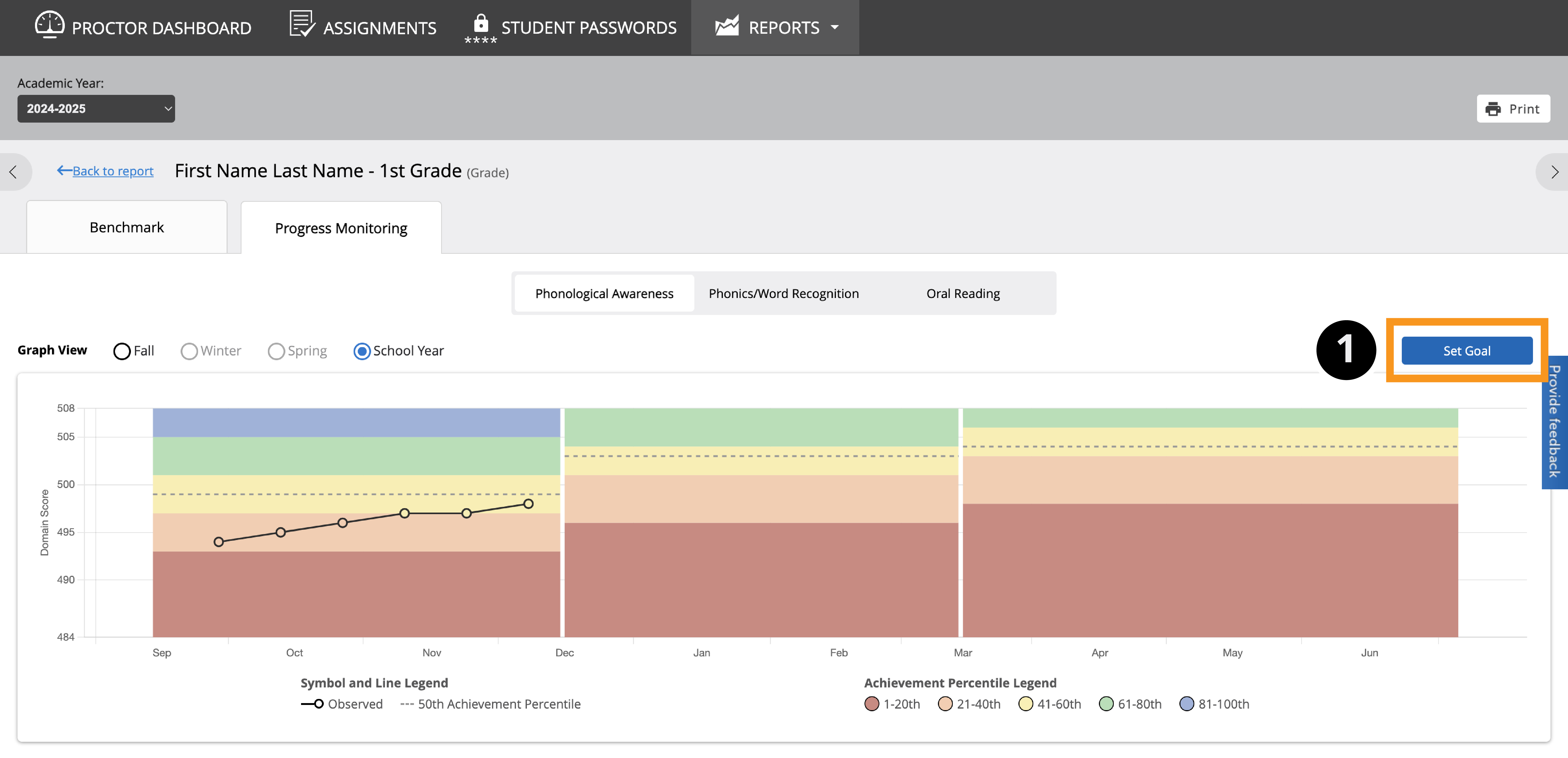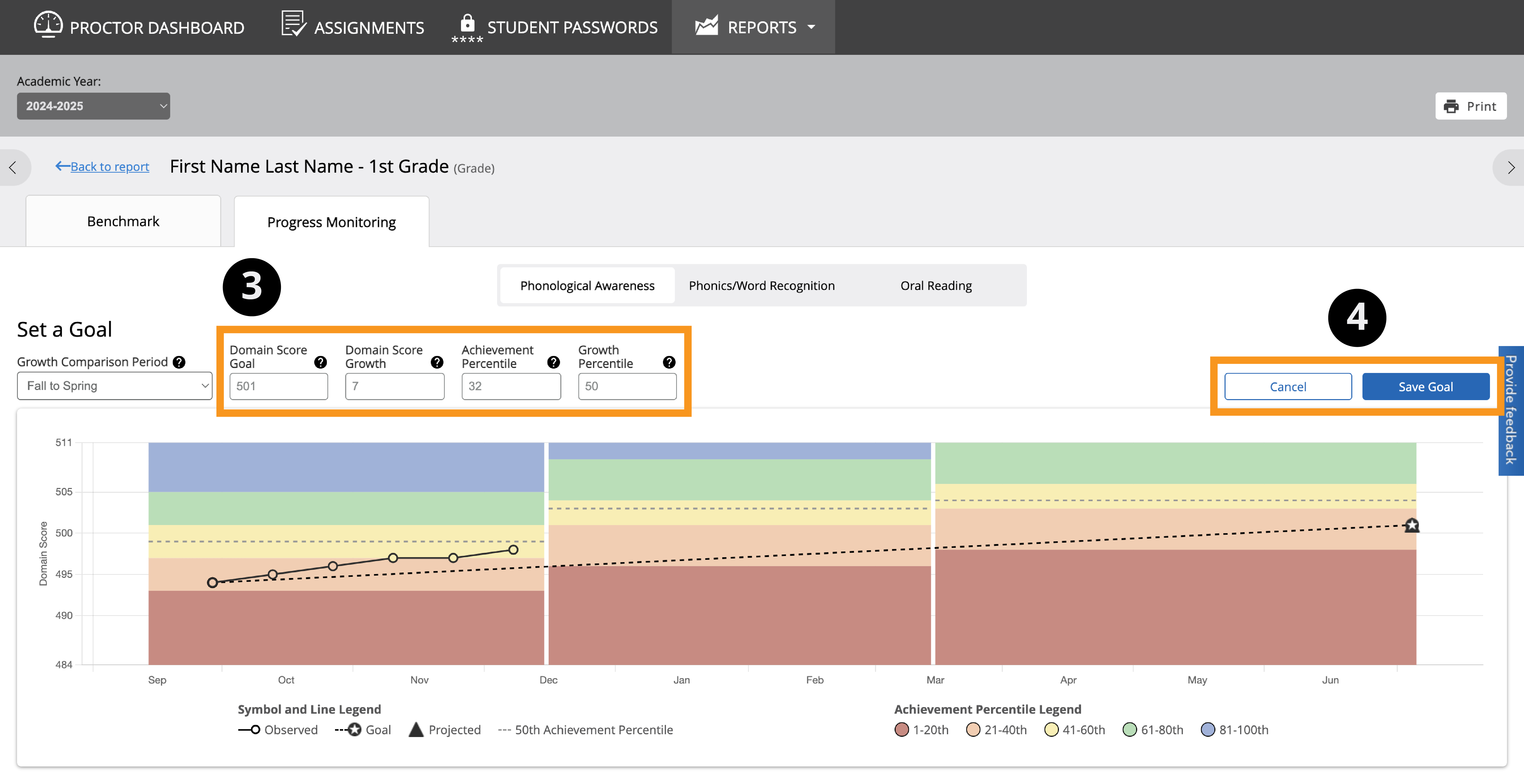 Note: By default, the starting values are set to the Projected Growth, representing a student’s anticipated progress with growth at the 50th percentile. You may adjust any of the fields to set a realistic goal for the student.