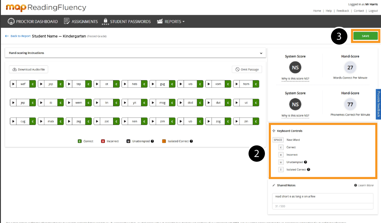 2. Use the Keyboard Controls to review and score the student's audio recording. For detailed instructions, refer to Keys and actions for hand scoring NWF.
