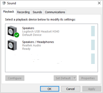 2. In both the Playback and Recording tabs, ensure the headset marked as the default device with a green checkmark (note that the headset may be categorized as “Speakers”; look for the name of the headset in gray to confirm it is the correct device)